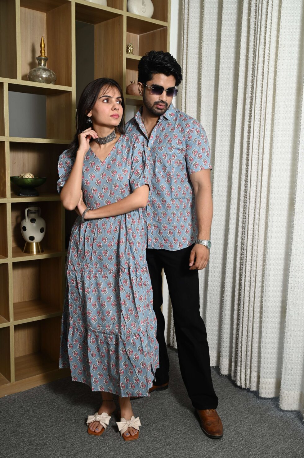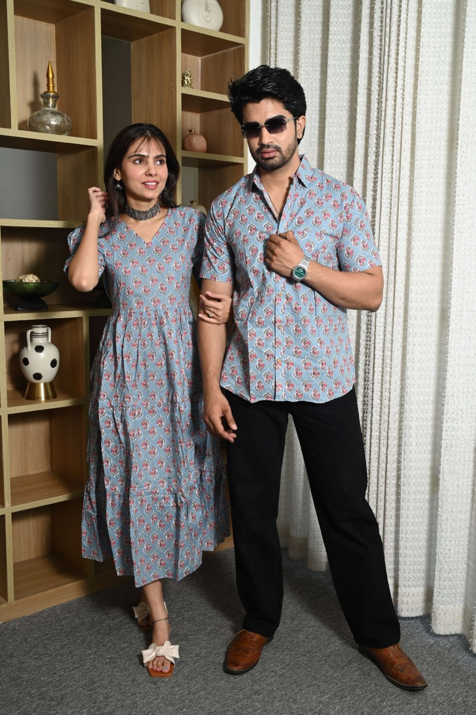 This Sky Blue Printed couple matching outfit includes a women?s flowy cotton midi dress and a men?s short-sleeve printed shirt. Designed with cheerful floral prints, this set is perfect for summer outings, casual gatherings, or twinning on vacations.